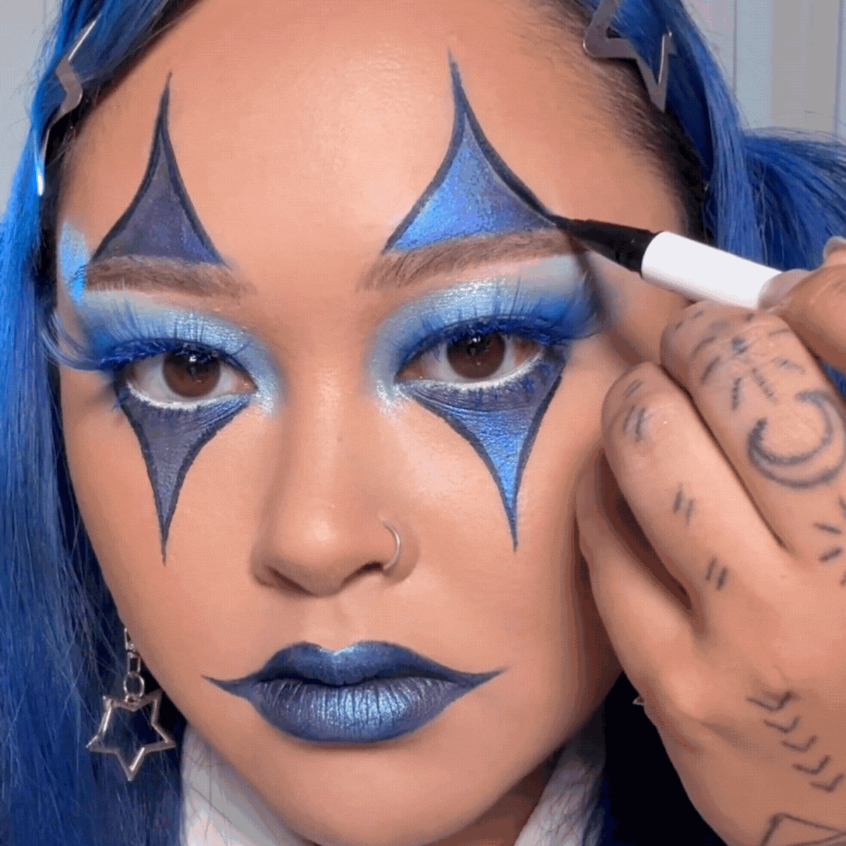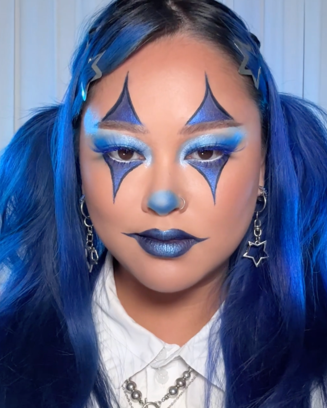With blown-out blues, exaggerated lashes and lips as dark as your sense of humor, this beat takes clown from campy to couture.